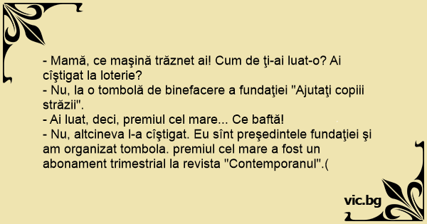 - Mamă, ce maşină trăznet ai! Сuм de ţi-ai luat-o? Ai cîştigat la loterie?