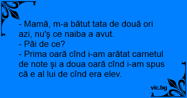 - Mamă, m-a bătut tata de două ori azi, nu'ş ce naiba a avut.