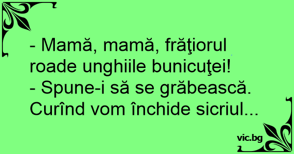 - Mamă, mamă, frăţiorul roade unghiile bunicuţei!