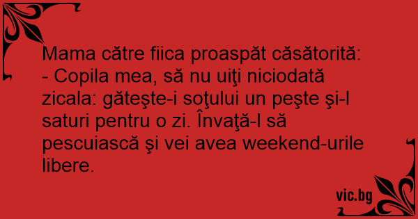 - Copila mea, să nu uiţi niciodată zicala: găteşte-i soţului un peşte şi-l saturi pentru o zi. Învaţă-l să pescuiască şi vei avea weekend-urile libere.