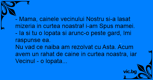 - Mama, cainele vecinului Nostru si-a lasat mizeria in curtea noastra! i-am Spus mamei.