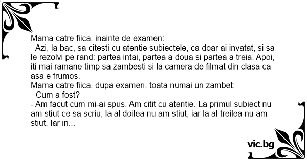 - Azi, la bac, sa citesti cu atentie subiectele, ca doar ai invatat, si sa le rezolvi pe rand: partea intai, partea a doua si partea a treia. Apoi, iti mai ramane timp sa zambesti si la camera de filmat din clasa ca asa e frumos.