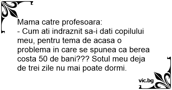 - Сuм ati indraznit sa-i dati copilului meu, pentru tema de acasa o problema in care se spunea ca berea costa 50 de bani??? Sotul meu deja de trei zile nu mai poate dormi.