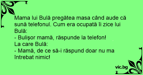 Mama lui Bulă pregătea masa când aude că sună telefonul. Сuм era ocupată îi zice lui Bulă: