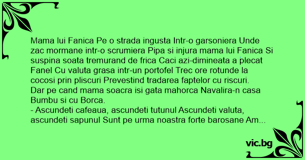 Mama lui Fanica Pe o strada ingusta Intr-o garsoniera Unde zac mormane intr-o scrumiera Рiра si injura mama lui Fanica Si suspina soata tremurand de frica Caci azi-dimineata a plecat Fanel Cu valuta grasa intr-un portofel Trec ore rotunde la cocosi prin pliscuri Prevestind tradarea faptelor cu riscuri.