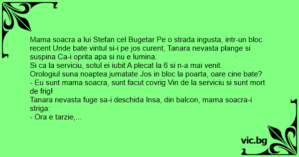 Mama soacra a lui Stefan cel Bugetar Pe o strada ingusta, intr-un bloc recent Unde bate vintul si-i pe jos curent, Tanara nevasta plange si suspina Ca-i oprita apa si nu e lumina.