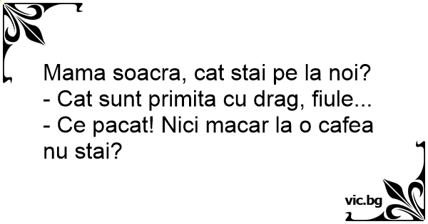 Soacra in vizita la nora. - Mama soacra, cat stai pe la noi? - Cat timp voi fi binevenita. - Aaa, nici la o cafea nu stai?