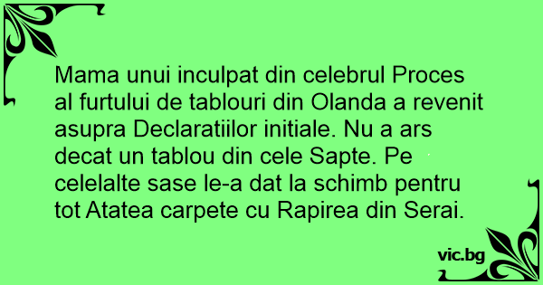 Mama unui inculpat din celebrul Proces al furtului de tablouri din Olanda a revenit asupra Declaratiilor initiale. Nu a ars decat un tablou din cele Sapte. Pe celelalte sase le-a dat la schimb pentru tot Atatea carpete cu Rapirea din Serai.