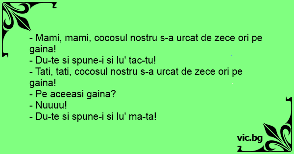 - Mămico, mămico, am văzut cocoşul pe găină de zece ori azi dimineaţă! - Du-te şi spune-i lui tăticu, el o să înţeleagă… - Tăticule, mi-a zis mămica să îţi spun că am văzut cocoşul pe găină de zece...