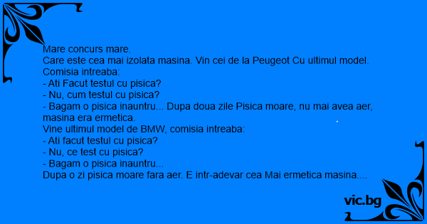- Bagam o pisica inauntru... Dupa doua zile Pisica moare, nu mai avea aer, masina era ermetica.