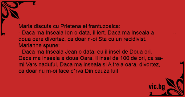 - Daca ma Inseala Ion o data, il iert. Daca ma Inseala a doua oara divortez, ca doar n-oi Sta cu un recidivist.
