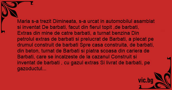 Maria s-a trezit Dimineata, s-a urcat in automobilul asamblat si inventat De barbati, facut din fierul topit ,de barbati, Extras din mine de catre barbati, a turnat benzina Din petrolul extras de barbati si prelucrat de Barbati, a plecat pe drumul construit de barbati Spre casa construita, de barbati, din beton, turnat de Barbati si piatra scoasa din cariera de Barbati, care se incalzeste de la cazanul Construit si inventat de barbati , cu gazul extras Si livrat de barbati, pe gazoductul construit de Barbati, s-a urcat cu liftul, montat de barbati, a Aprins lumina, care vine pe firele electrice puse de barbati, De la centrala electrica construita de barbati, la Becul inventat de barbati, dupa care si-a turnat Apa, care vine pe tevile construite de barbati, Fiarta pe aragazul construit de barbati, cafea, Adusa cu avioanele construite si inventate de Barbati, de pe plantatiile pe care lucreaza Barbatii, cu un cornulet din faina de Grau, recoltat de barbati, adus la magazinele construite De barbati, a pasat pe butonul calculatorului, asamblat Si inventat de barbati, a deschis o programa, Creata de barbati, a intrat pe internet, inventat de Barbati si a scris cu litere, din alfabetul inventat de Barbati: