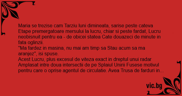 Maria se trezise cam Tarziu luni dimineata, sarise peste cateva Etape premergatoare mersului la lucru, chiar si peste fardat, Lucru neobisnuit pentru ea - de obicei statea Cate douazeci de minute in fata oglinzii.