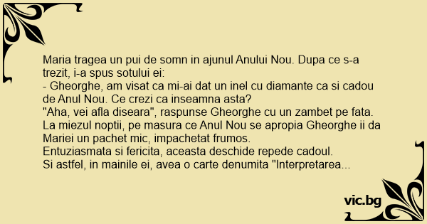 - Gheorghe, am visat ca mi-ai dat un inel cu diamante ca si cadou de Anul Nou. Ce crezi ca inseamna asta?