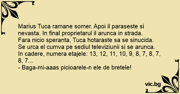 Marius Tuca ramane somer. Apoi il paraseste si nevasta. In final proprietarul il arunca in strada.