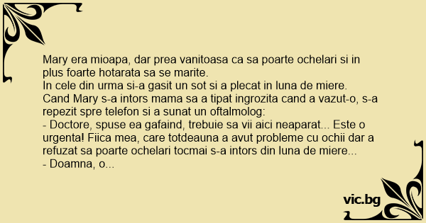 - Doctore, spuse ea gafaind, trebuie sa vii aici neaparat... Este o urgenta! Fiica mea, care totdeauna a avut probleme cu ochii dar a refuzat sa poarte ochelari tocmai s-a intors din luna de miere...