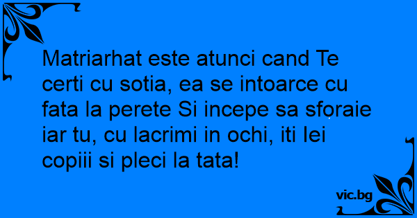 Matriarhat este atunci cand Te certi cu sotia, ea se intoarce cu fata la perete Si incepe sa sforaie iar tu, cu lacrimi in ochi, iti Iei copiii si pleci la tata!