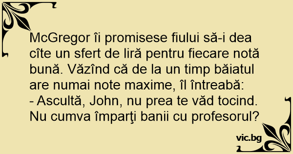 McGregor îi promisese fiului să-i dea cîte un sfert de liră pentru fiecare notă bună. Văzînd că de la un timp băiatul are numai note maxime, îl întreabă: