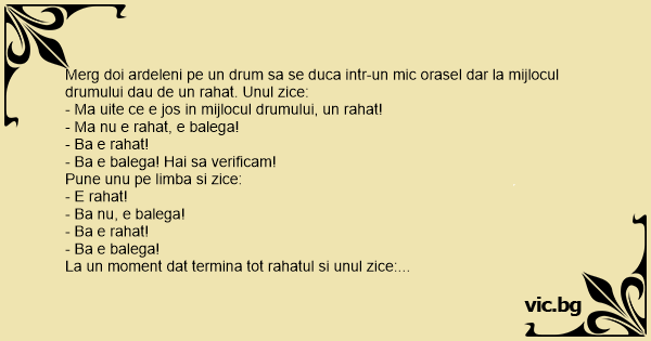 Merg doi ardeleni pe un drum sa se duca intr-un mic orasel dar la mijlocul drumului dau de un rahat. Unul zice: