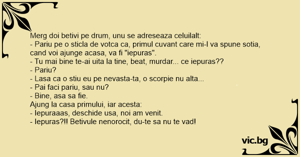 - Pariu pe o sticla de votca ca, primul cuvant care mi-l va spune sotia, cand voi ajunge acasa, va fi "iepuras".
