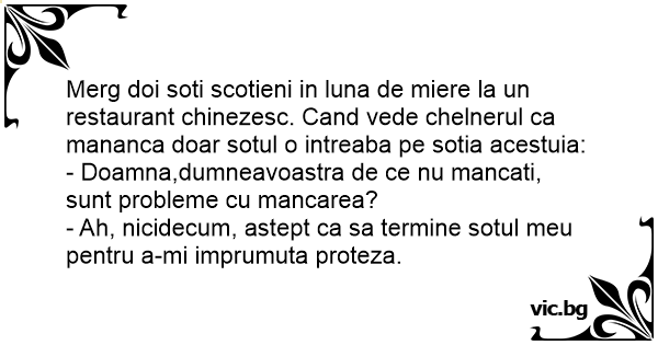 Merg doi soti scotieni in luna de miere la un restaurant chinezesc. Cand vede chelnerul ca mananca doar sotul o intreaba pe sotia acestuia: