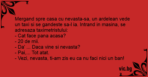 Mergand spre casa cu nevasta-sa, un ardelean vede un taxi si se gandeste sa-l ia. Intrand in masina, se adresaza taximetristului: