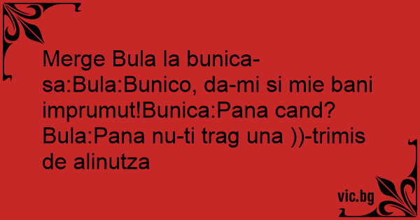 Merge Bula la bunica-sa:Bula:Bunico, da-mi si mie bani imprumut!Bunica:Pana cand?Bula:Pana nu-ti trag una ))-trimis de alinutza