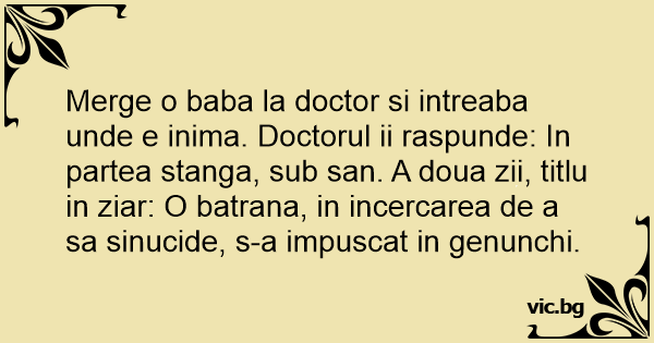 Merge o baba la doctor si intreaba unde e inima. Doctorul ii raspunde: In partea stanga, sub san. A doua zii, titlu in ziar: O batrana, in incercarea de a sa sinucide, s-a impuscat in genunchi.