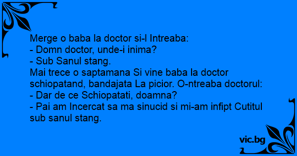 Merge o baba la doctor si-l Intreaba: - Domn doctor, unde-i inima? - Sub Sanul stang. Mai trece o saptamana Si vine baba la doctor schiopatand, bandajata La picior. O-ntreaba doctorul: - Dar de ce Schiopatati, doamna? - Pai am Incercat sa ma sinucid si mi-am infipt Cutitul sub sanul stang.
