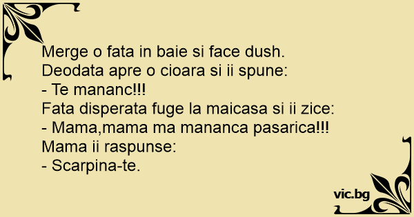 Merge o fata in baie si face dush.<br />Deodata apre o cioara si ii spune:<br />- Te mananc!!!<br />Fata disperata fuge la maicasa si ii zice:<br />- Mama,mama ma mananca pasarica!!!<br />Mama ii raspunse:<br />- Scarpina-te.