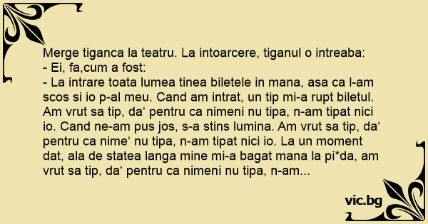 Merge tiganca la teatru. La intoarcere, tiganul o intreaba: - Ei, fa,сuм a fost: - La intrare toata lumea tinea biletele in mana, asa ca l-am scos si io p-al meu. Cand am intrat, un tip mi-a rupt biletul. Am vrut sa tip, da‘ pentru ca nimeni nu tipa, n-am tipat nici io. Cand ne-am pus jos, s-a stins lumina. Am vrut sa tip, da‘ pentru ca nime‘ nu tipa, n-am tipat nici io. La un moment dat, ala de statea langa mine mi-a bagat mana la pi*da, am vrut sa tip, da‘ pentru ca nimeni nu tipa, n-am tipat nici io. Tiganul: - Lasa asta, piesa, piesa сuм a fost? - Mult mai BUUNNNNNAAAAAA ca a ta!