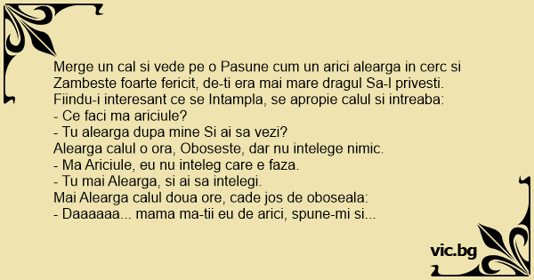 Merge un cal si vede pe o Pasune сuм un arici alearga in cerc si Zambeste foarte fericit, de-ti era mai mare dragul Sa-l privesti. Fiindu-i interesant ce se Intampla, se apropie calul si intreaba:
