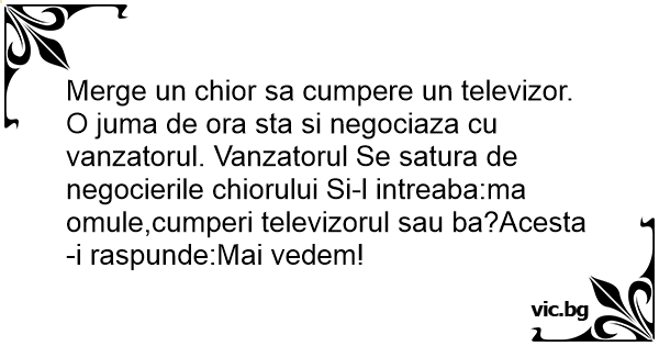 O juma de ora sta si negociaza cu vanzatorul. Vanzatorul Se satura de negocierile chiorului Si-l intreaba:ma omule,cumperi televizorul sau ba?Acesta-i raspunde:Mai vedem!