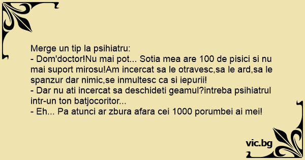 - Dom'doctor!Nu mai рот... Sotia mea are 100 de pisici si nu mai suport mirosu!Am incercat sa le otravesc,sa le ard,sa le spanzur dar nimic,se inmultesc ca si iepurii!