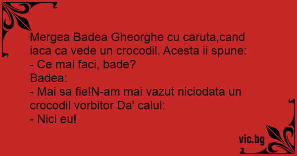 Mergea Badea Gheorghe cu caruta,cand iaca ca vede un crocodil. Acesta ii spune: