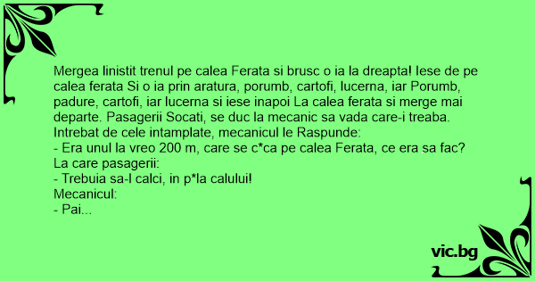 Mergea linistit trenul pe calea Ferata si brusc o ia la dreapta! Iese de pe calea ferata Si o ia prin aratura, porumb, cartofi, lucerna, iar Porumb, padure, cartofi, iar lucerna si iese inapoi La calea ferata si merge mai departe. Pasagerii Socati, se duc la mecanic sa vada care-i treaba.