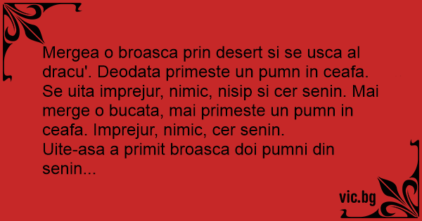 Mergea o broasca prin desert si se usca al dracu'. Deodata primeste un pumn in ceafa. Se uita imprejur, nimic, nisip si cer senin. Mai merge o bucata, mai primeste un pumn in ceafa. Imprejur, nimic, cer senin.