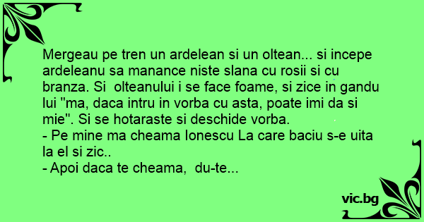 Mergeau pe tren un ardelean si un oltean... si incepe ardeleanu sa manance niste slana cu rosii si cu branza. Si olteanului i se face foame, si zice in gandu lui "ma, daca intru in vorba cu asta, poate imi da si mie". Si se hotaraste si deschide vorba.