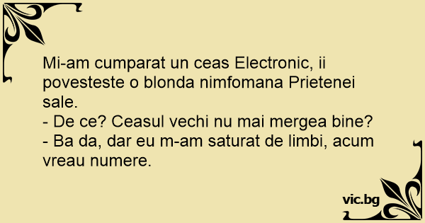 Mi-am cumparat un ceas Electronic, ii povesteste o blonda nimfomana Prietenei sale.