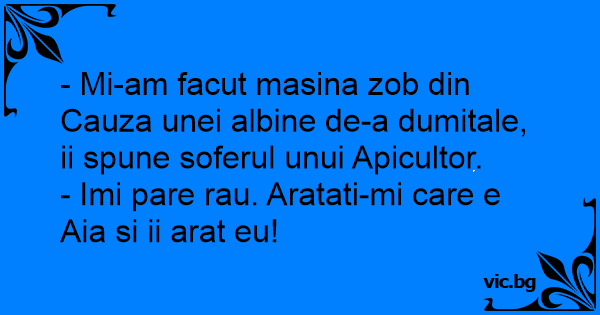 - Mi-am facut masina zob din Cauza unei albine de-a dumitale, ii spune soferul unui Apicultor.