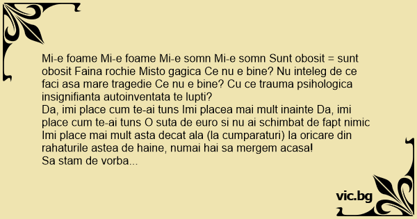 Mi-e foame Mi-e foame Mi-e somn Mi-e somn Sunt obosit = sunt obosit Faina rochie Misto gagica Ce nu e bine? Nu inteleg de ce faci asa mare tragedie Ce nu e bine? Cu ce trauma psihologica insignifianta autoinventata te lupti?