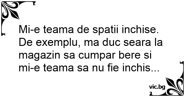 Mi-e teama de spatii inchise. De exemplu, ma duc seara la magazin sa cumpar bere si mi-e teama sa nu fie inchis...
