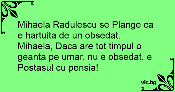 Mihaela Radulescu se Plange ca e hartuita de un obsedat. Mihaela, Daca are tot timpul o geanta pe umar, nu e obsedat, e Postasul cu pensia!