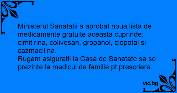 Ministerul Sanatatii a aprobat noua lista de medicamente gratuite aceasta cuprinde: cimitirina, colivosan, gropanol, clopotal si cazmacilina.
