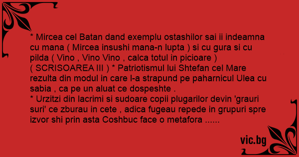 * Mircea cel Batan dand exemplu ostashilor sai ii indeamna cu mana ( Mircea insushi mana-n lupta ) si cu gura si cu pilda ( Vino , Vino Vino , calca totul in picioare ) ( SCRISOAREA III ) * Patriotismul lui Shtefan cel Mare rezulta din modul in care l-a strapund pe paharnicul Ulea cu sabia , ca pe un aluat ce dospeshte .