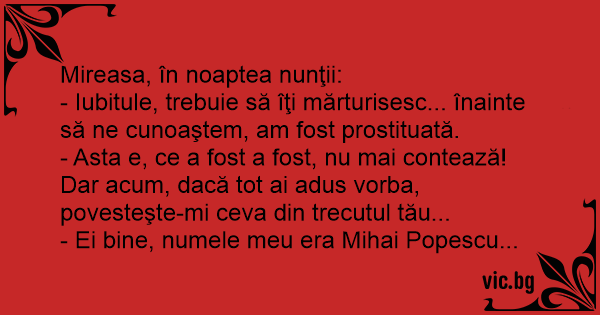 - Iubitule, trebuie să îţi mărturisesc... înainte să ne cunoaştem, am fost prostituată.