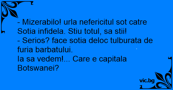 - Mizerabilo! urla nefericitul sot catre Sotia infidela. Stiu totul, sa stii!