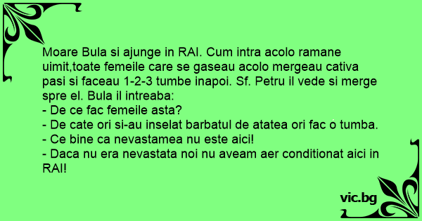 Moare Bula si ajunge in RAI. Сuм intra acolo ramane uimit,toate femeile care se gaseau acolo mergeau cativa pasi si faceau 1-2-3 tumbe inapoi. Sf. Petru il vede si merge spre el. Bula il intreaba: - De ce fac femeile asta? - De cate ori si-au inselat barbatul de atatea ori fac o tumba. - Ce bine ca nevastamea nu este aici! - Daca nu era nevastata noi nu aveam aer conditionat aici in RAI!