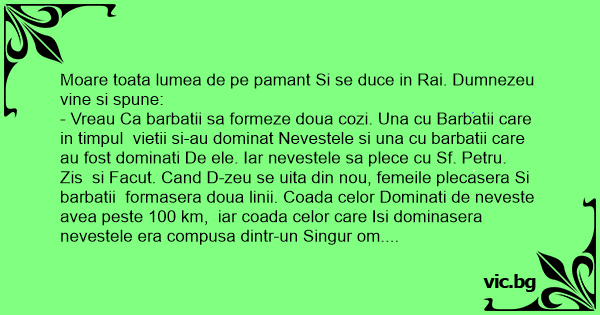 - Vreau Ca barbatii sa formeze doua cozi. Una cu Barbatii care in timpul vietii si-au dominat Nevestele si una cu barbatii care au fost dominati De ele. Iar nevestele sa plece cu Sf. Petru.