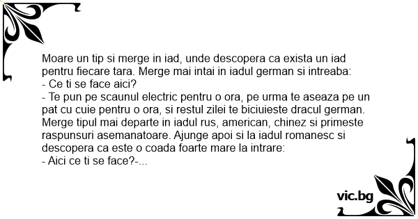Moare un tip si merge in iad, unde descopera ca exista un iad pentru fiecare tara. Merge mai intai in iadul german si intreaba: